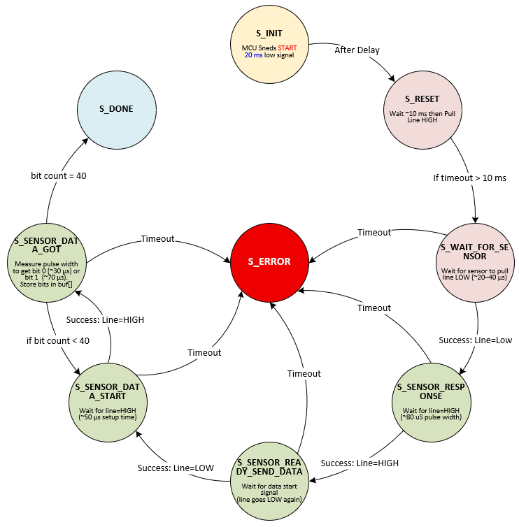 - Initialization: The microcontroller sends a start signal by pulling the data line low for a specified period.