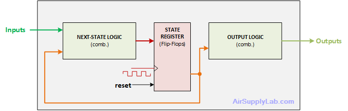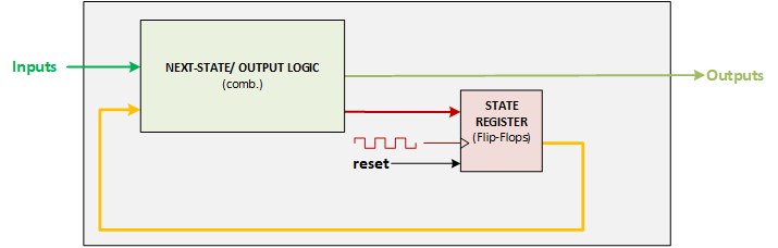 next_state. - Output Logic: logic that computes outputs (Moore or Mealy rules).